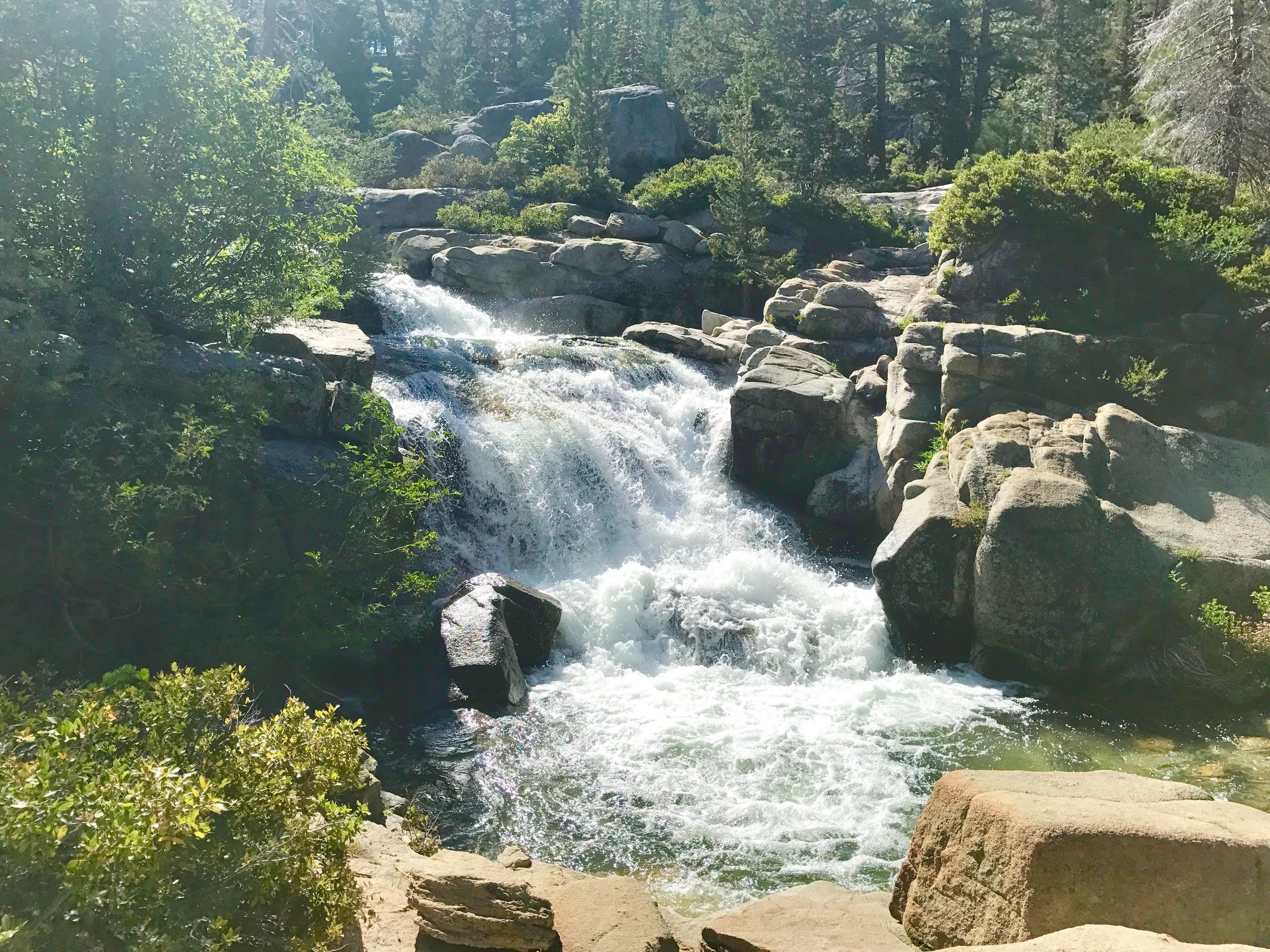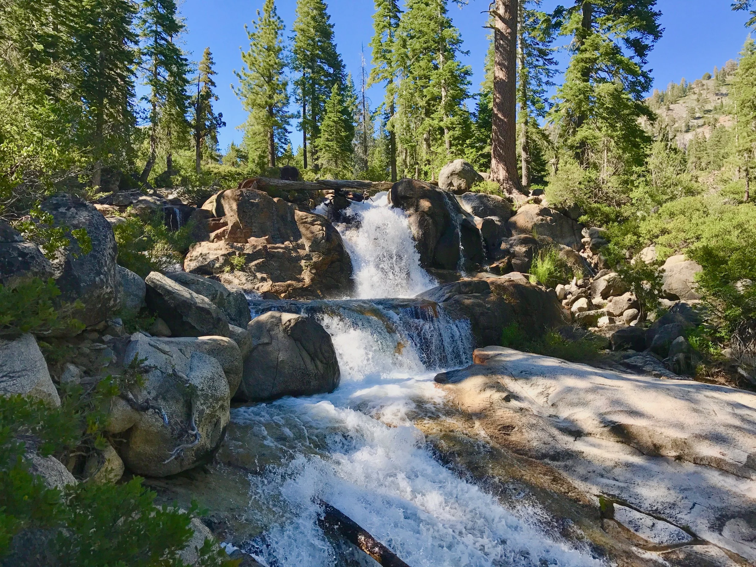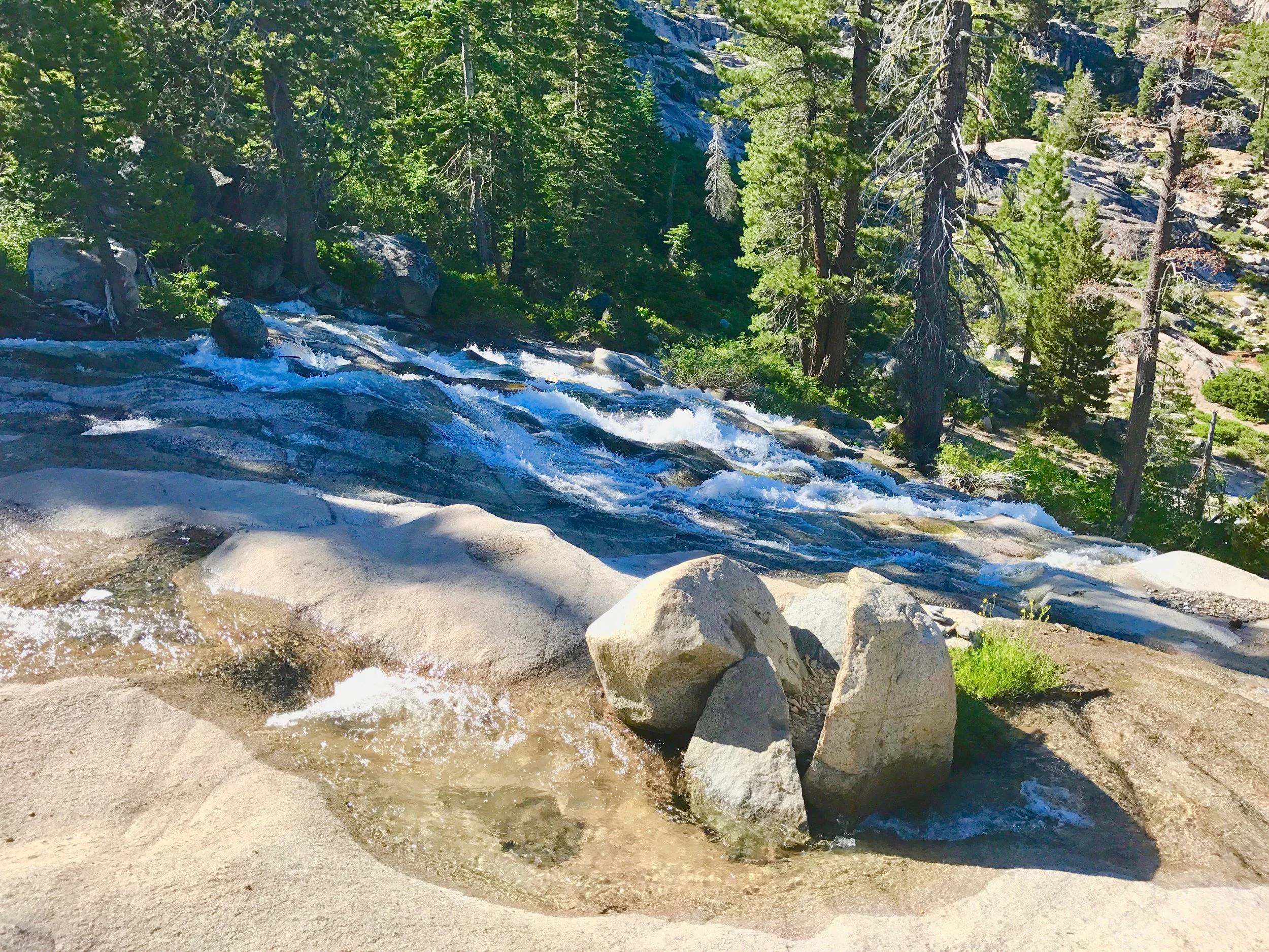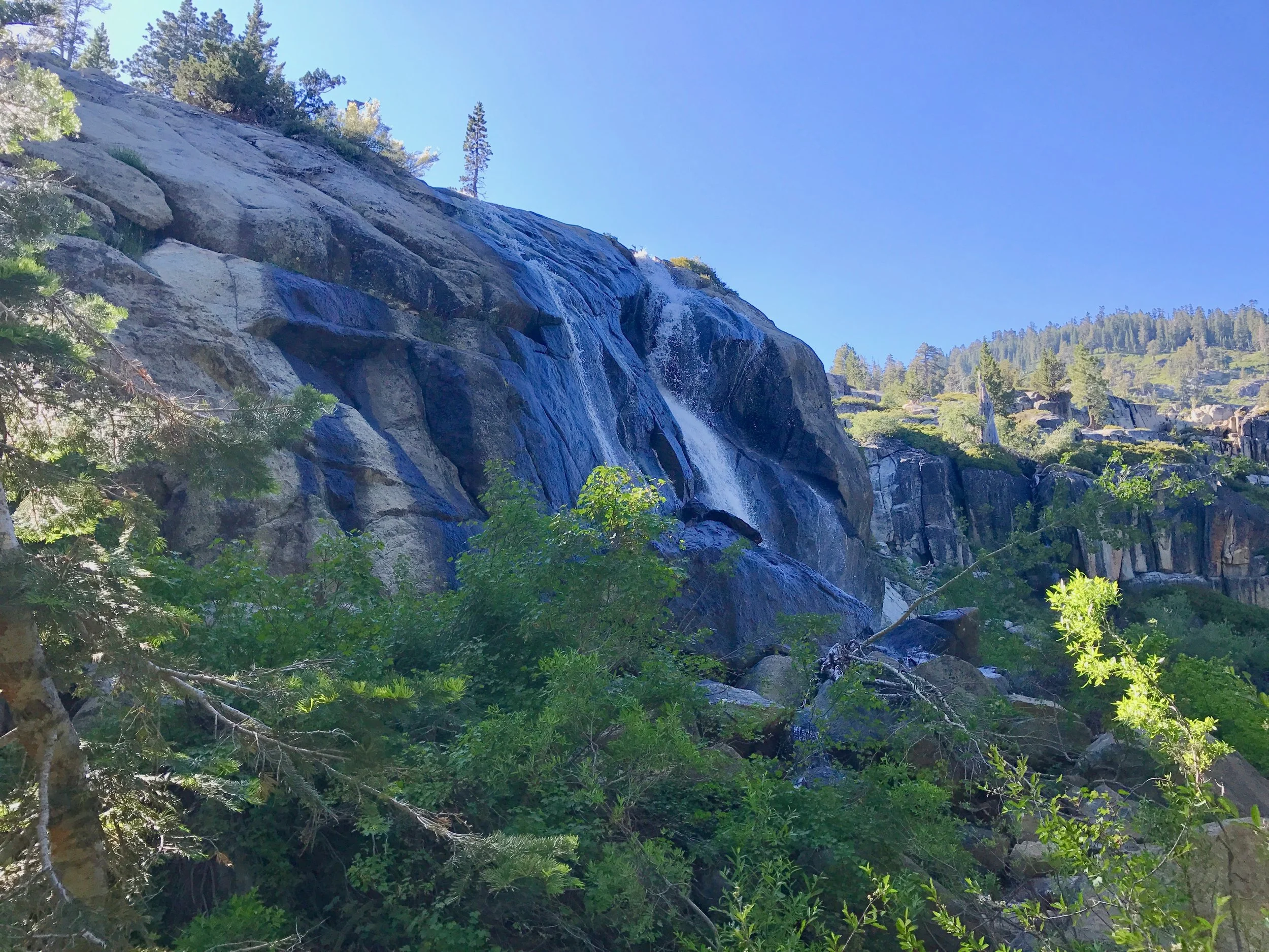Monday July 17, 2017. Austin and I headed up the Shirley Canyon Trail in Squaw Valley, CA. The "trail" starts at 6200' elevation and terminates at High Camp, elevation 8200'. Options for getting down are a free ride on the Squaw Valley tram, or hike back down. Although we intended on taking the tram back (it was already after 4p when we started up), the tram had stopped running for the day when we "summited". My bad. So we hiked down a couple of the ski runs. Took about 1.5 hours to walk down. Squaw Valley ski resort is really big. The creek is seasonal and fed solely from snow run off. We have hiked this trail in the past when by mid-summer the stream is a trickle or not running at all. But not this year!